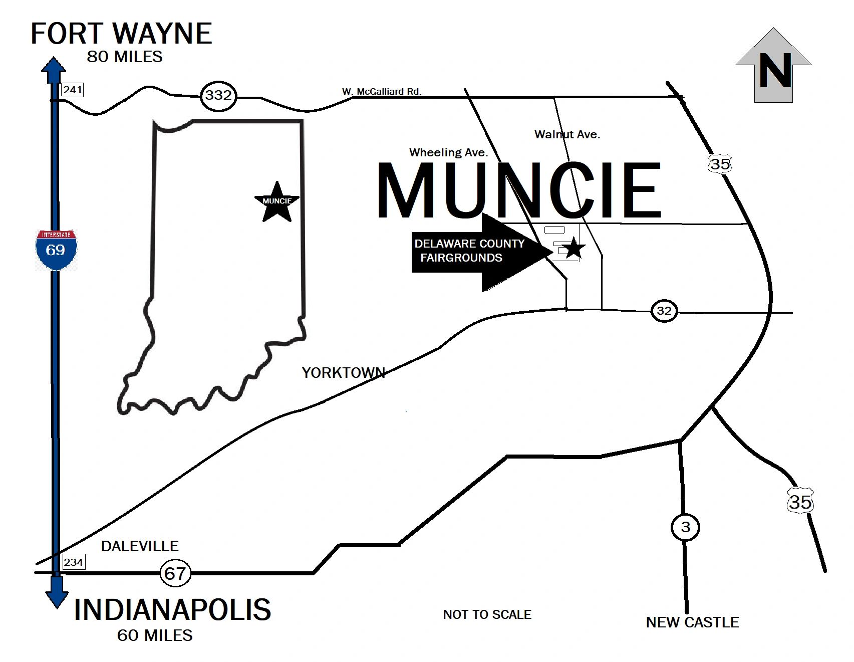 Directions from I-69 Exit 241, IN-332 E./ W. McGalliard Rd. Go 8.4 miles to N. Wheeling Avenue. Make a Right turn on N. Wheeling Avenue, go 1 mile to Delaware County Fairgrounds. Turn left. Enter the Delaware County Fairgrounds and follow the road to the Right to the Memorial Building.